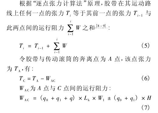 平穩(wěn)運(yùn)行。實(shí)際的設(shè)計(jì)計(jì)算表明,對(duì)于一般的皮帶輸送機(jī)凹弧段半徑的計(jì)算,式( 1) 的計(jì)算結(jié)果可滿足要求。但在某些條件下,式( 2) 、( 3) 的計(jì)算結(jié)果也會(huì)大于式( 1) 的所得,從而導(dǎo)致半徑過(guò)大給工藝布置帶來(lái)一定的困難。查式( 2) 、( 3) ,可采取加大拉緊力的方法以增大Tc值,使其計(jì)算結(jié)果得到減小。下面將討論凹弧段起始點(diǎn)張力Tc的計(jì)算方法。