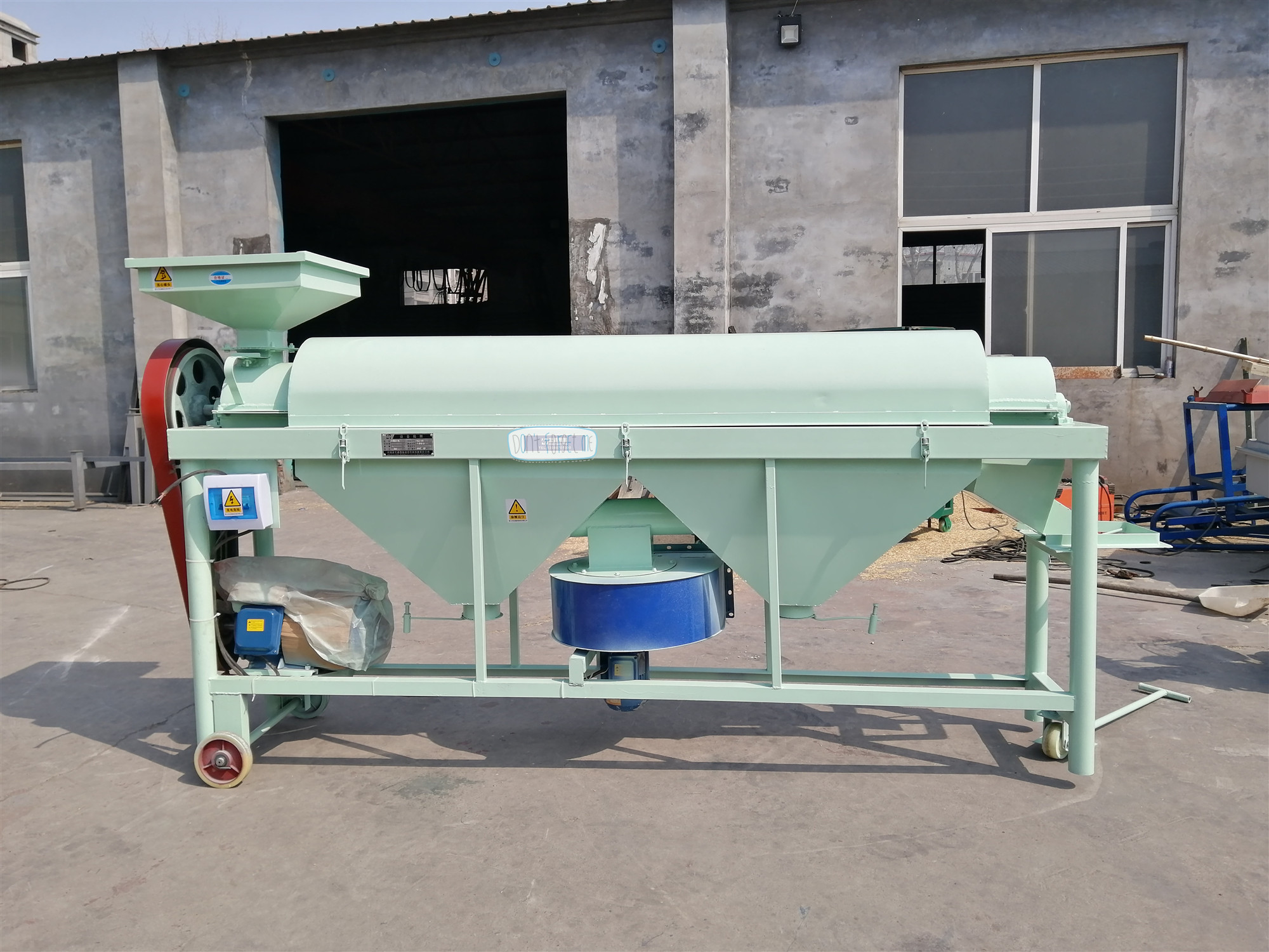 【產(chǎn)品簡介】水稻除芒機,是一種專門用于對帶芒水稻種子及其它帶芒刺種子進行芒、刺處理的機具。適用于種子加工成套設(shè)備的配套使用。 結(jié)構(gòu)特點  該機主要由:機殼、傳動軸、打桿、活門調(diào)節(jié)裝置、驅(qū)動裝置等部件組成。采用旋轉(zhuǎn)打桿及其配合的內(nèi)襯耐磨板,對種子表面施加搓擠、打擊作用,以除去芒、刺毛、松散的穎片及未脫凈的穗頭、莢殼等。通過清除芒、刺,改善了種子的表面,有利于種子加工的下道工序的作業(yè)。