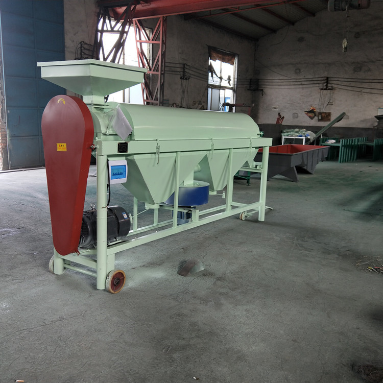 物料投放到進(jìn)料斗后,打開(kāi)電源,把風(fēng)力調(diào)到適中,機(jī)器篩面做往復(fù)式運(yùn)動(dòng),風(fēng)機(jī)高速運(yùn)轉(zhuǎn),打開(kāi)下料插板,物料落到篩面上篩選,機(jī)器共有三層篩網(wǎng),一層篩選出來(lái)的是大于水稻的雜質(zhì),水稻和小于稻種的雜質(zhì)落二層篩網(wǎng)上,塵土小于水稻雜質(zhì)落到三層篩網(wǎng)上,各自從前端的出料篩出來(lái),粉塵通過(guò)抽塵風(fēng)箱抽出來(lái)。